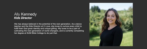 Ally has always believed in the potential of the next generation. As a dance teacher and the Kids Director at C-Love, she loves to nurture every child to fulfill their God given identity and unique gifting. Ally loves to be a part of cultivating the next generation of world changers, and is currently completing her degree at SUM Bible College to do just that.
