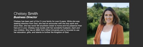 Chelsey has been part of the C-Love family for over 8 years. While she was seeking direction from God, she had an encounter with the holy spirit and since then, she has never felt anywhere closer to home and his presence than here at C-Love. Chelsey lives locally with her wonderful husband, Zach and two children. She has an MBA from Alfred University and is honored to use her education, gifts, and talents to further the Kingdom of God.